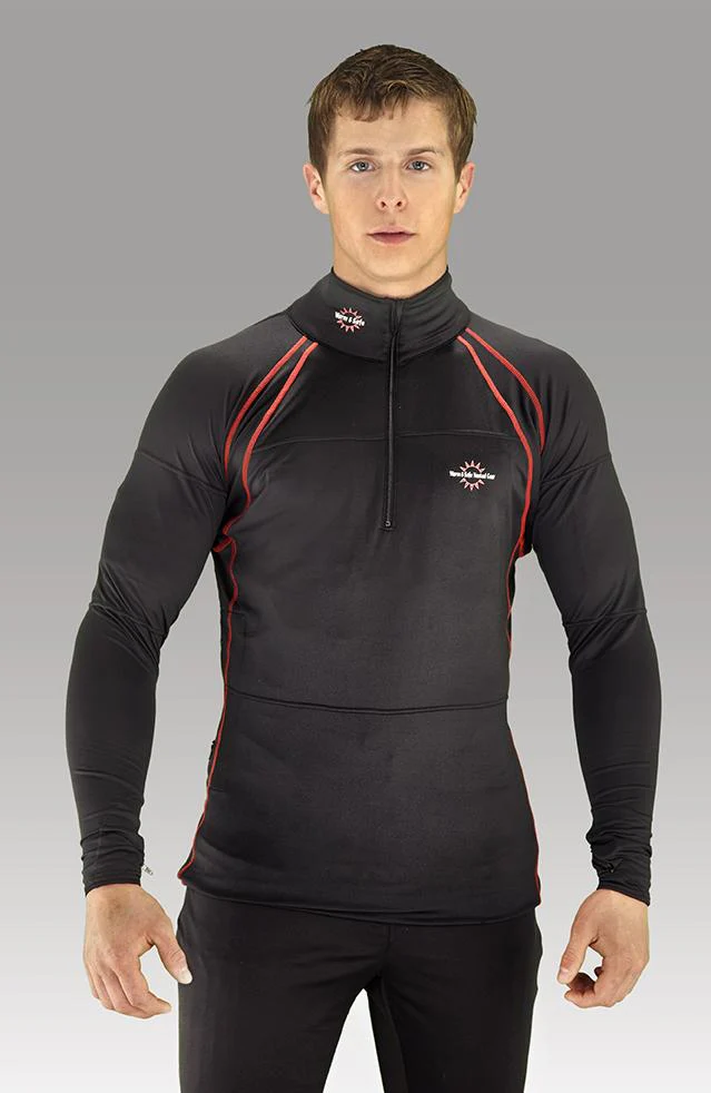 High-tech, moisture-wicking stretch material. There is simply no better fabric for this type of garment. Much like a close-fitting base layer, the stretch material holds the garment – and above all the heating panels – snugly against the body for optimal heat transfer. This high efficiency means that less power and heat are required to achieve a comfortable temperature. Beyond the fit, the material is designed for high comfort and effective moisture management. Users often comment that, in addition to feeling the warmth, the garment fits so well that you hardly notice it is there.